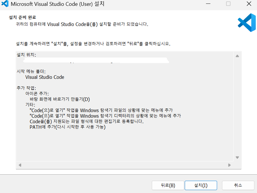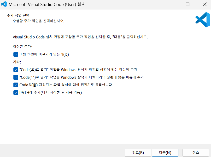 시작프로그램도 넘어가주면 설치 과정에 포함할 추가 작업을 선택할 수 있습니다.