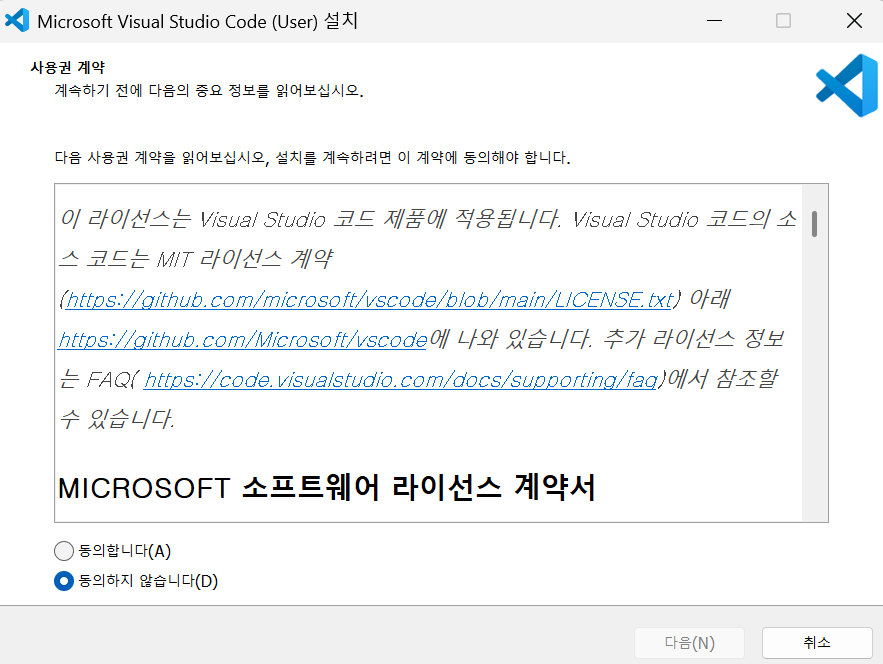 다운받은 exe 파일을 실행 시켜주고 "동의합니다" 체크 후 [다음] 버튼 눌러줍니다.