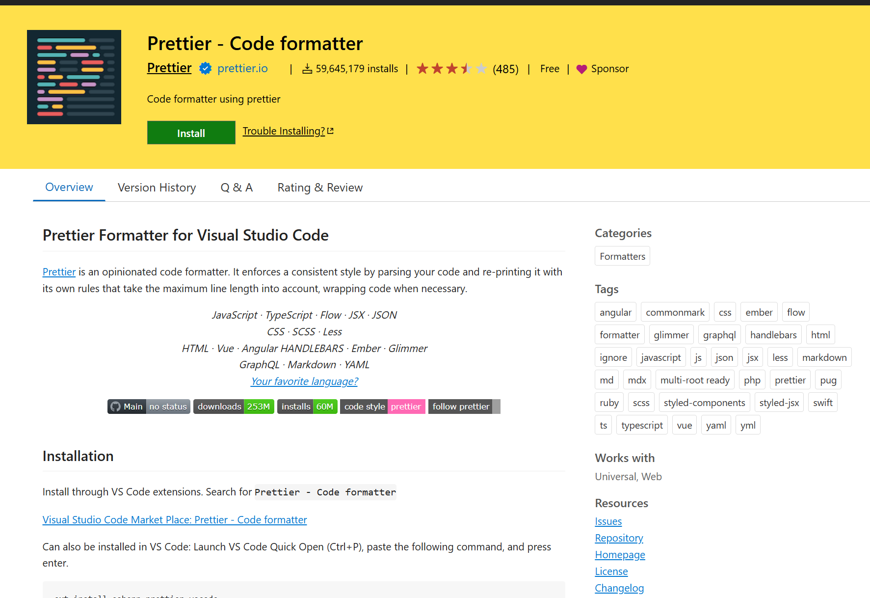 우선 첫번째, Prettier - Code formatter로 소스코드를 보기 좋게 해주는걸 다운 받겠습니다.