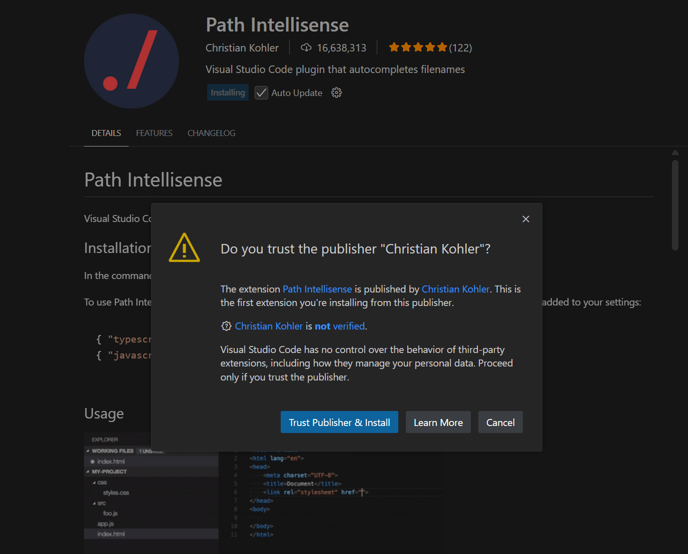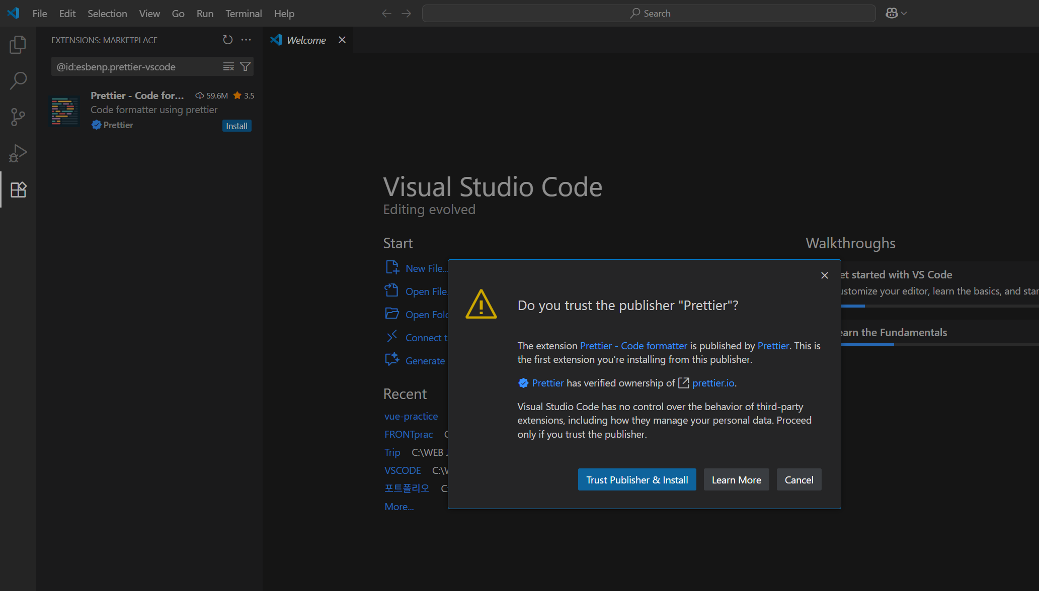 이건 따로 이름 검색으로 받아줄게요. Trust Publisher & Install 클릭!