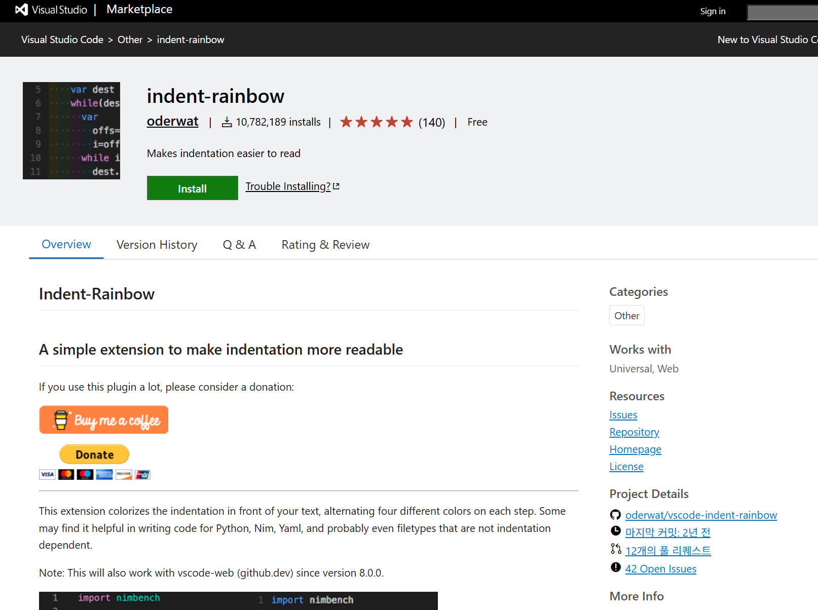 다음은 indent-rainbow라는 들여쓰기를 보기 편하게 해주는 프로그램도 궁금하니까 받아볼게요.